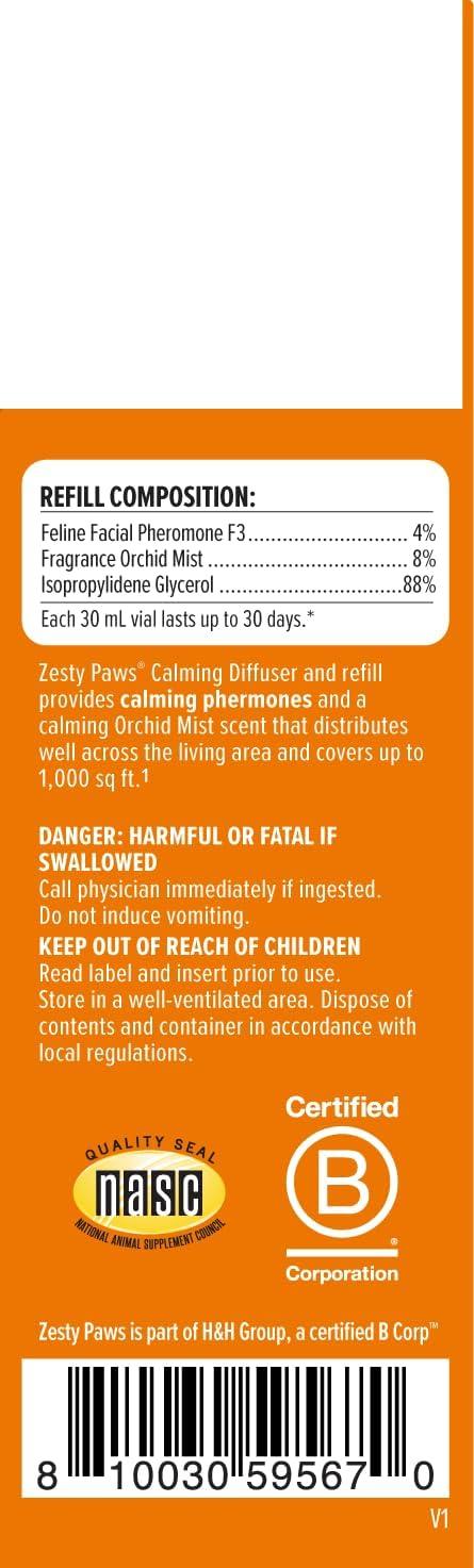 Directions Instructions for Use: Plug into standard outlet in the room your cat spends the majority of their time or a central location. Keep the diffuser plugged in at all times and replace the refill every 30 days. Use with standard 120V AC only. Never use with extension cords, voltage converters or adaptors. Only use Zesty Paws® Calming Diffuser refills with Zesty Paws brand diffuser. Replace diffuser every 12 months. Refill will last 30 days on Level 1.