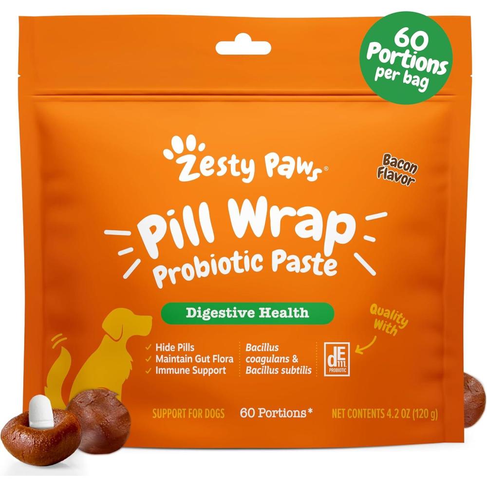 That's a “Wrap” on Boring Medications! – Zesty Paws Pill Wrap Probiotic Paste is a tasty way to hide and pocket any pills, tablets, and capsules your dog takes.